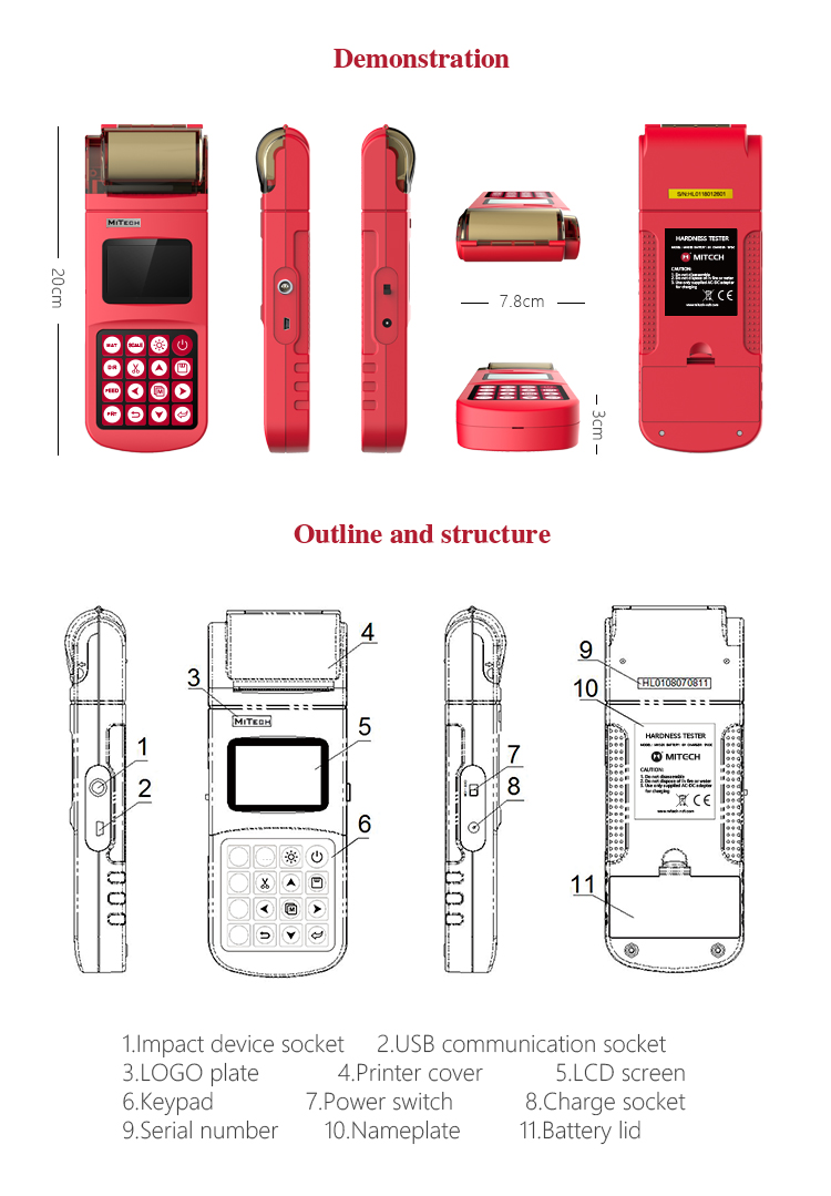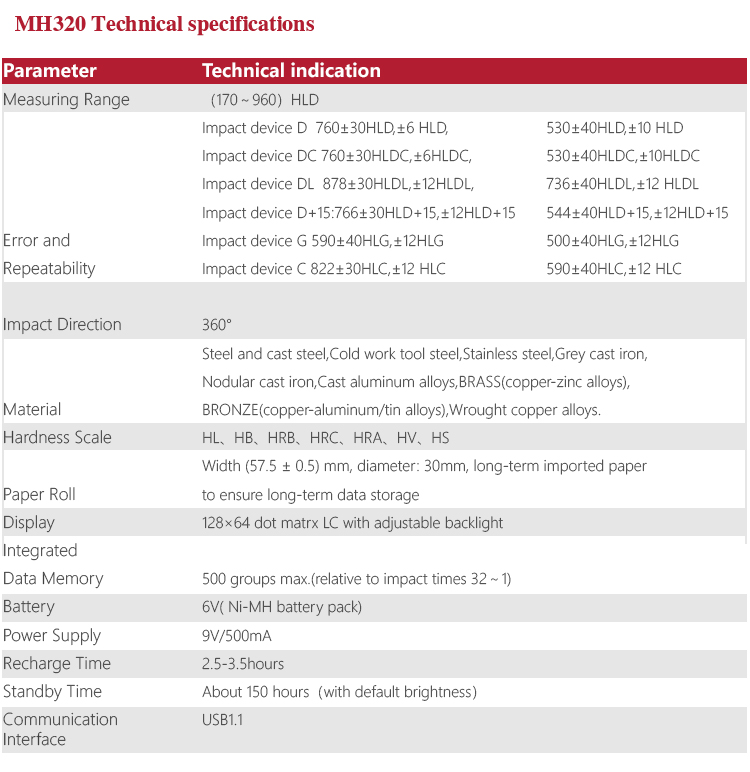 Product OverviewMH320 portable Leeb hardness tester is based on Leeb hardness measurement principle, it can be quickly and easily used for on-site testing hardness of metallic materials and support free conversion between Leeb, Brinell, Rockwell hardness and other scales. It uses 128 × 64 dot matrix LCD screen, rich information, intuitive, stable performance and integrated high-speed thermal printer, which enables printing with instant measurement results.It can be widely used in metal processing and manufacturing, special equipment, permanent component failure analysis, inspection and other fields. It is particularly suitable for large parts and non-removable part of the on-site hardness testing. It is to improve production efficiency and pass rate and is a wise choice to save the cost of production.