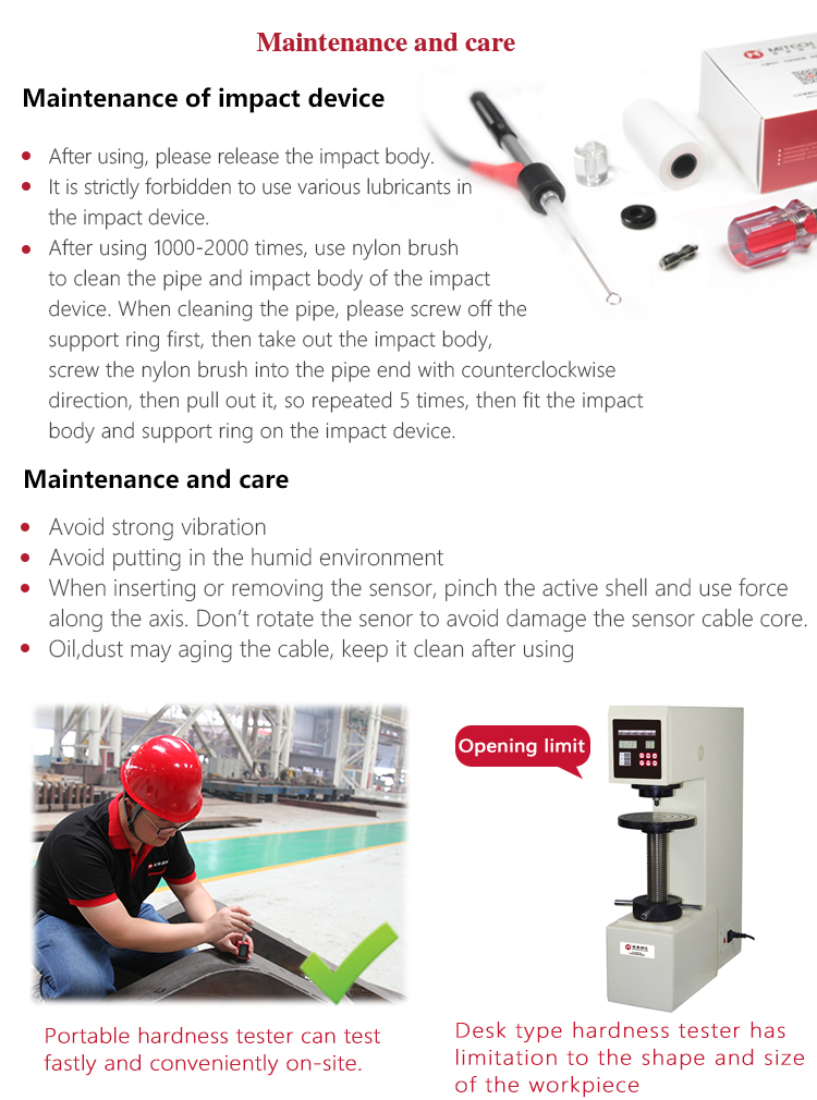 | The C type impact device of Mitech portable hardness tester, length: 141mm, weight: 75g, diameter:20mm, has build-in small C impact body. The impact force of C impact device is smaller, only 1/4 of the D impact ball. It is suitable for the hardness testing for the small and thin parts and surface hardened layers with weight above 1.5kg, the thickness above 1mm and above 0.2mm hardened layer. It makes minimal damage to workpiece surface and does not destroy the hardened layer. It can realize the precise measurements for Leeb, Brinell, Rockwell and others. |