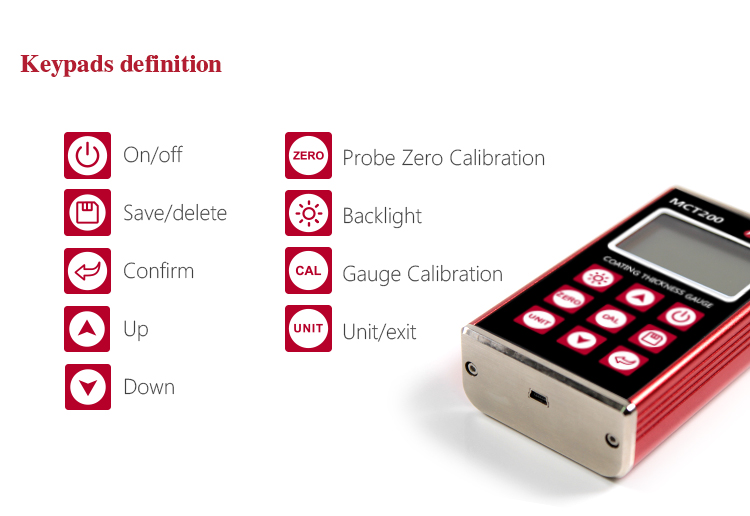 With different external probes, the gauge can be applied to measuring thickness of non-magnetic coating on magnetic metal substrate, as well as non-conductive coating on non-magnetic metal substrate.