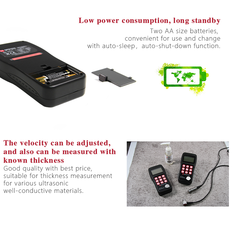 Mitech series ultrasonic thickness gauges, with low-power design and long standby, MT150/MT160/MT200/MT180/MT190/MT600/MT660 are with two AA size alkaline batteries for power supply, easy to replace.