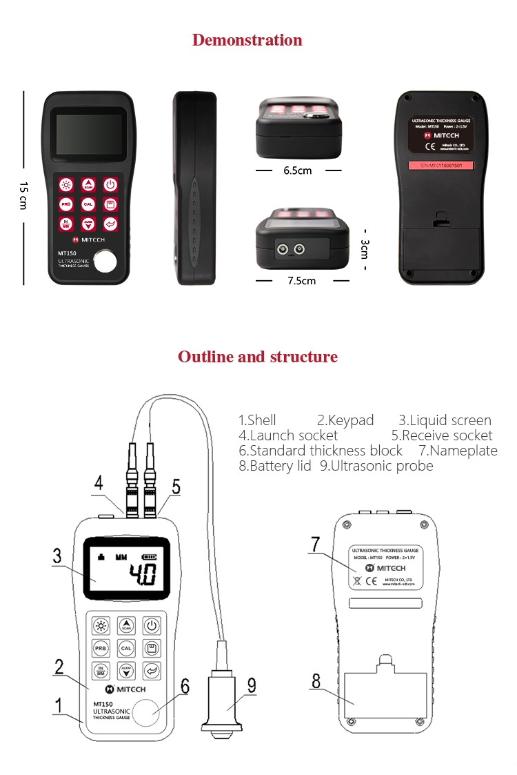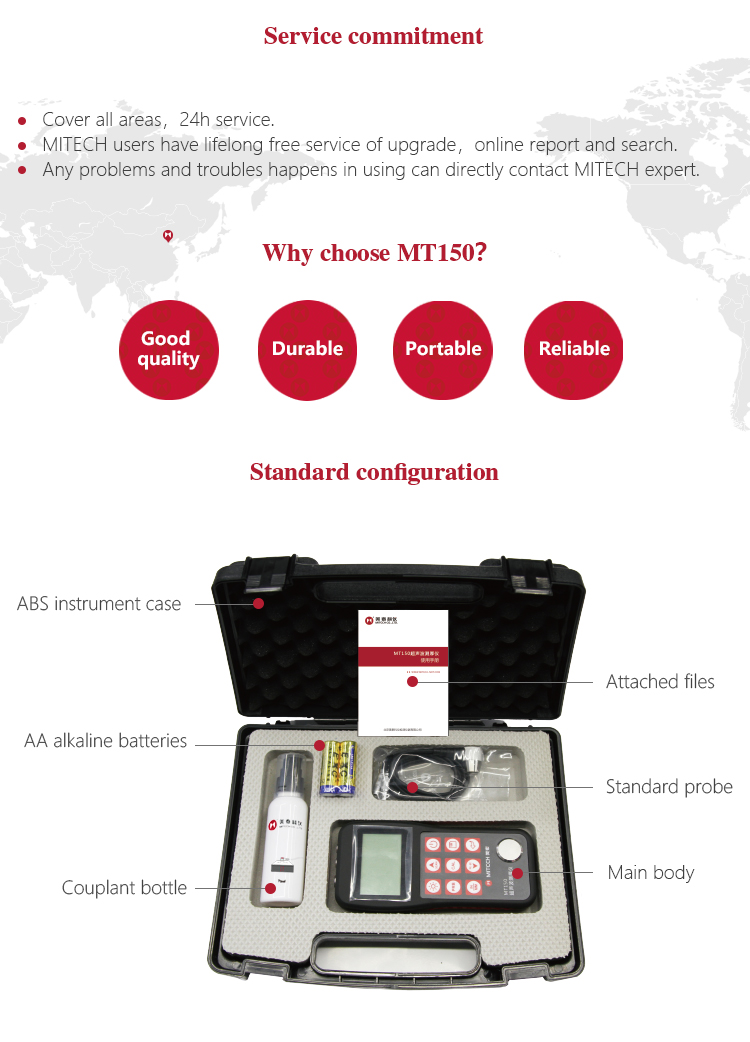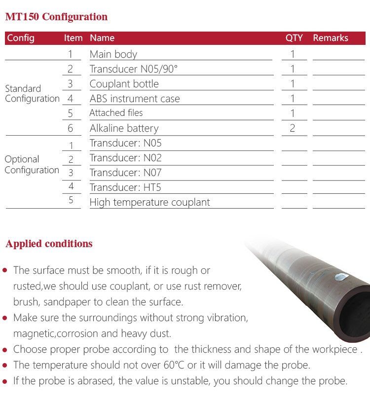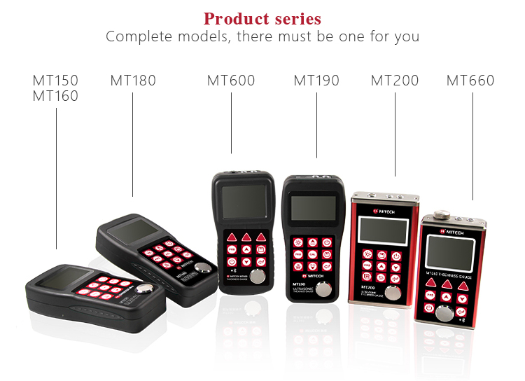 Product OverviewThe model MT150 is a digital ultrasonic thickness gauge. Based on the principle of ultrasonic principle, the instrument is capable of measuring the thickness of various materials, such as metal, plastic, ceramic, glass and many other good ultrasonic conductors. It of all kinds of materials. Compared with the traditional measurement methods, the advantages of ultrasonic thickness gauge is exposed to one side of the workpiece to complete the measurement. Its unique non-destructive testing performance provide the perfect solution for the thickness testing of closed pipes, containers, etc. It is widely used in pertroleum , chemical ,metallurgy, shipbuilding, aviation, aerospace and other fields because of monitoring corrosion thinning degree of various pipes and pressure vessels. It can also be used for precise measurement of sheet metal and machined parts.