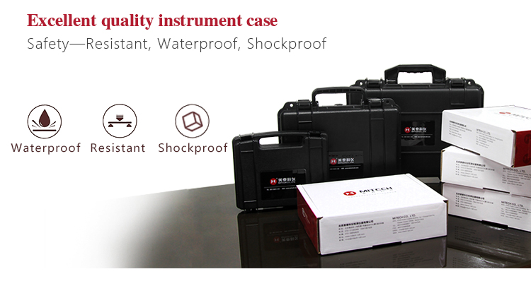 The instrument case of Mitech ultrasonic thickness gauge, length: 27cm, width: 22.5cm, height: 7.5cm and weight: 0.698kg, designed with ABS engineering plastic, It has excellent performance like waterproof, shockproof, excellent heat resistance and low temperature resistance. It can effectively prevent oil, dust and corrosion in harsh environment. Its size in line with the standards for aviation and train carrying (capable of putting under the seat and on the luggage rack), it is safe, reliable and stable.