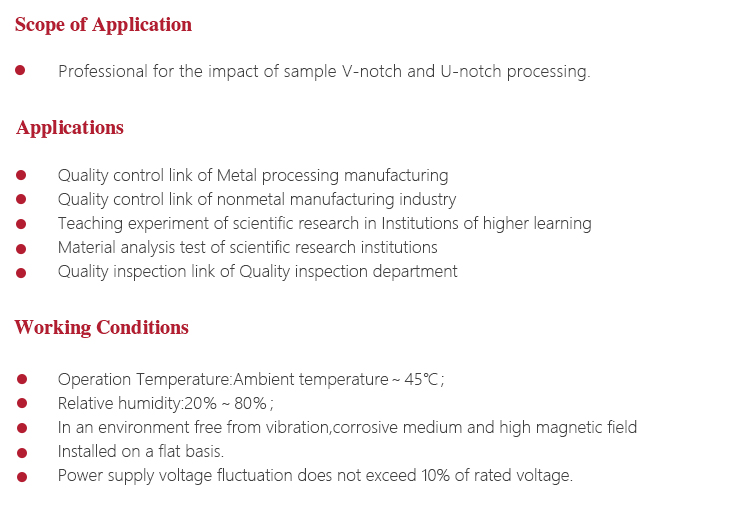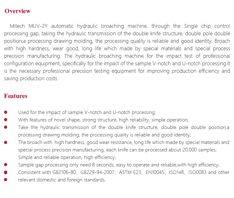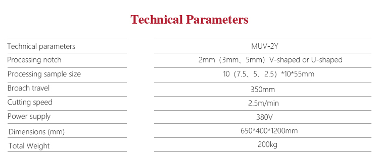 Mitech MUV-2Y automatic hydraulic broaching machine, through the Single chip control processing gap, taking the hydraulic transmission of the double knife structure, double pole double position,a processing drawing molding, the processing quality is reliable and good identity; Broach with high hardness, wear good, long life which made by special materials and special process precision manufacturing. The hydraulic broaching machine for the impact test of professional configuration equipment,specifically for the impact of the sample V-notch and U-notch processing.It is the necessary professional precision testing equipment for improving production efficiency and saving production costs.