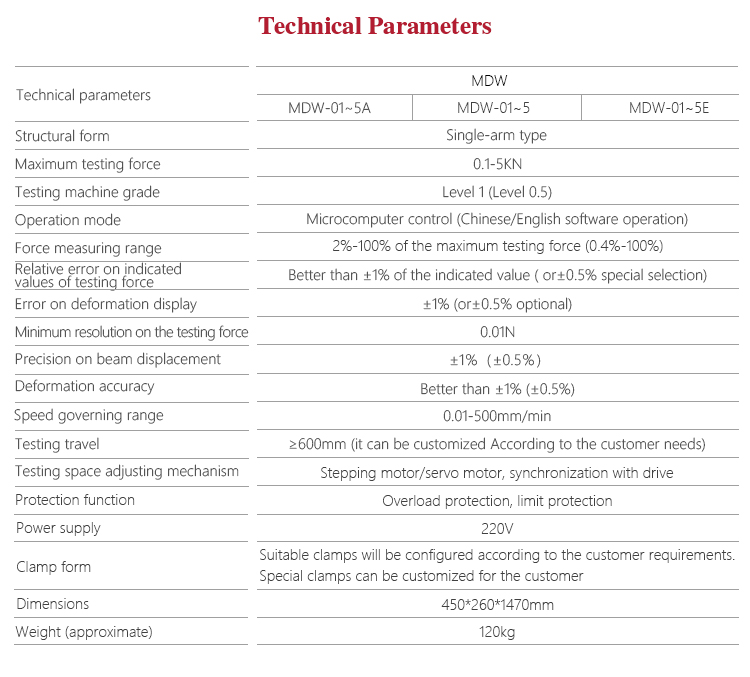 Mitech MDW micro control series single-arm electronic tensile testing machine, through the computer control motor drive screw, equipped with the corresponding auxiliary for metal, non-metallic and composite materials for pull, pressure, bending and other mechanical properties test (Tensile test carried out between the upper beam of the main body and the moving beam. Compression and bending tests carried out between the table of the host and the moving beam). It’s adopts the built-in controller, AC servo motor, by computer-aided means to achieve powerful function with stable performance, strong structure, high reliability, simple operation, high degree of automation. It’s widely used in metal and non-metallic processing industry, quality inspection departments, scientific research and other areas of higher education institutions and it’s a necessary professional precision testing equipment for improve production efficiency and save production costs.