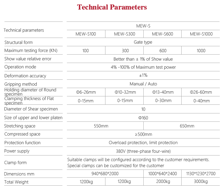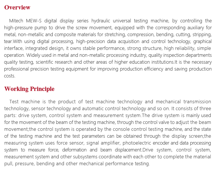 Product OverviewMitech MEW-S digital display series hydraulic universal testing machine, by controlling the high-pressure pump to drive the screw movement, equipped with the corresponding auxiliary for metal, non-metallic and composite materials for stretching, compression, bending, cutting, stripping, tear.With using digital processing, high-precision data acquisition and control technology, graphical interface, integrated design, it owns stable performance, strong structure, high reliability, simple operation. Widely used in metal and non-metallic processing industry, quality inspection departments quality testing, scientific research and other areas of higher education institutions.It is the necessary professional precision testing equipment for improving production efficiency and saving production costs.
