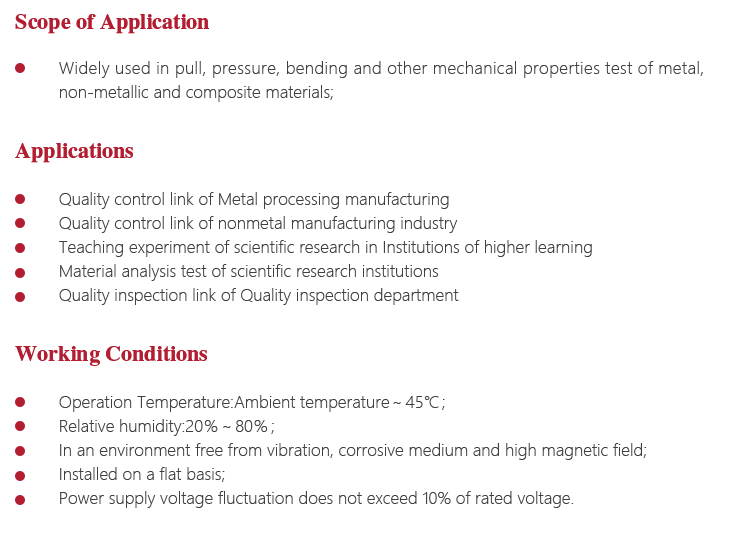 Working PrincipleTest machine is the product of test machine technology and mechanical transmission technology, sensor technology and automatic control technology and so on. It consists of three parts: drive system, control system and measurement system.The drive system is mainly used for the movement of the beam of the testing machine, through the control valve to adjust the beam movement;the control system is operated by the console control testing machine, and the state of the testing machine and the test parameters can be obtained through the display screen;the measuring system uses force sensor, signal amplifier, photoelectric encoder and data processing system to measure force, deformation and beam displacement.Drive system, control system, measurement system and other subsystems coordinate with each other to complete the material pull, pressure, bending and other mechanical performance testing.