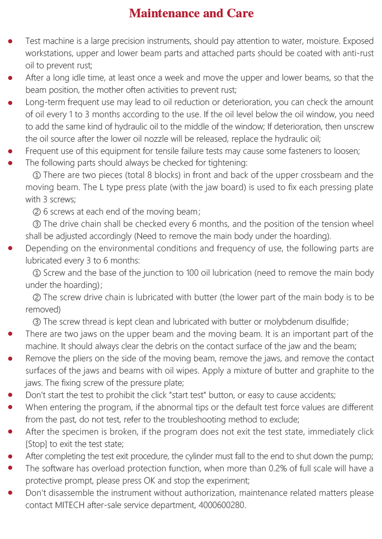 <!--[if !supportLists]--> l <!--[endif]-->Test machine is a large precision instruments, should pay attention to water, moisture. Exposed workstations, upper and lower beam parts and attached parts should be coated with anti-rust oil to prevent rust;