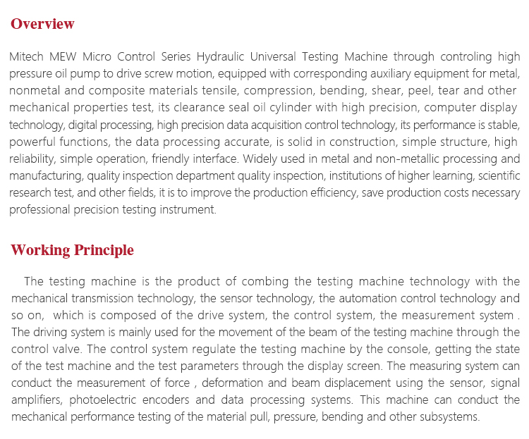 Product OverviewMitech MEW Micro Control Series Hydraulic Universal Testing Machine through controling high pressure oil pump to drive screw motion, equipped with corresponding auxiliary equipment for metal, nonmetal and composite materials tensile, compression, bending, shear, peel, tear and other mechanical properties test, its clearance seal oil cylinder with high precision, computer display technology, digital processing, high precision data acquisition control technology, its performance is stable, powerful functions, the data processing accurate, is solid in construction, simple structure, high reliability, simple operation, friendly interface. Widely used in metal and non-metallic processing and manufacturing, quality inspection department quality inspection, institutions of higher learning, scientific research test, and other fields, it is to improve the production efficiency, save production costs necessary professional precision testing instrument.