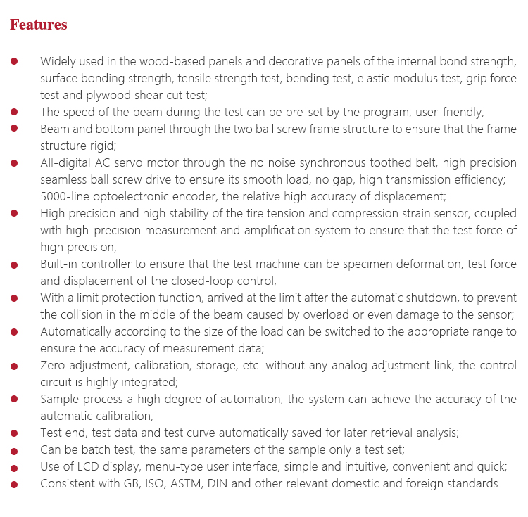 Instrument Featuresl Widely used in the wood-based panels and decorative panels of the internal bond strength, surface bonding strength, tensile strength test, bending test, elastic modulus test, grip force test and plywood shear cut test;