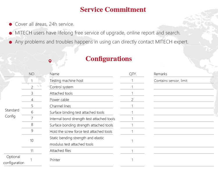 Product OverviewMitech MDW-MS series digital display artificial board universal testing machine, through the single-chip automatic control motor driving screw movement, can do various of physical and chemical properties of the test for wood-based panels and decorative panels. With built-in controller, AC servo motor, automatic control and data acquisition system, stable performance, strong structure, high reliability, simple operation, high degree of automation, it widely used in the wood-based panels and decorative panels of the internal bond strength, surface bonding strength, tensile strength test, bending test, elastic modulus test, grip force test and plywood shear cut test. It is a necessary professional precision testing equipment for improve production efficiency and save production costs.