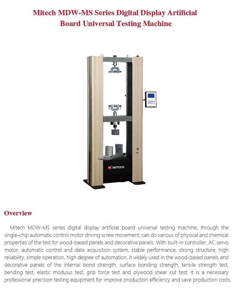 Product OverviewMitech MDW-MS series digital display artificial board universal testing machine, through the single-chip automatic control motor driving screw movement, can do various of physical and chemical properties of the test for wood-based panels and decorative panels. With built-in controller, AC servo motor, automatic control and data acquisition system, stable performance, strong structure, high reliability, simple operation, high degree of automation, it widely used in the wood-based panels and decorative panels of the internal bond strength, surface bonding strength, tensile strength test, bending test, elastic modulus test, grip force test and plywood shear cut test. It is a necessary professional precision testing equipment for improve production efficiency and save production costs.