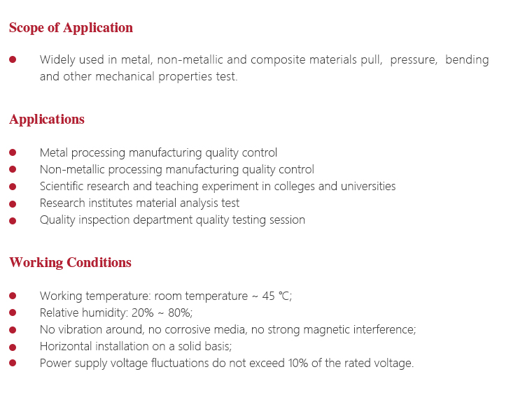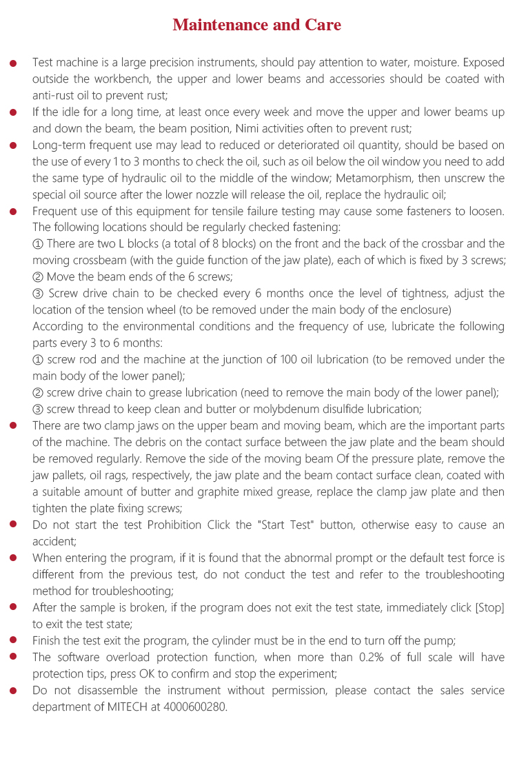 l Test machine is a large precision instruments, should pay attention to water, moisture. Exposed outside the workbench, the upper and lower beams and accessories should be coated with anti-rust oil to prevent rust;