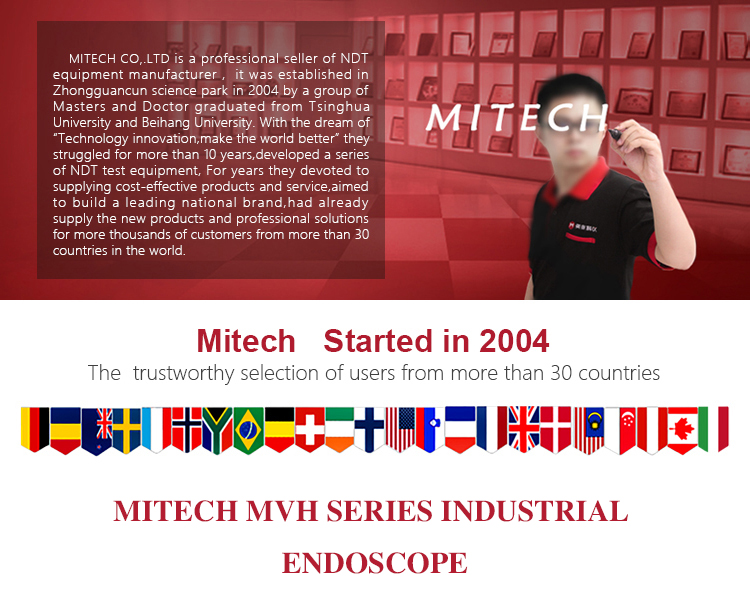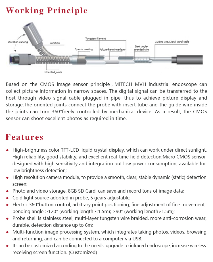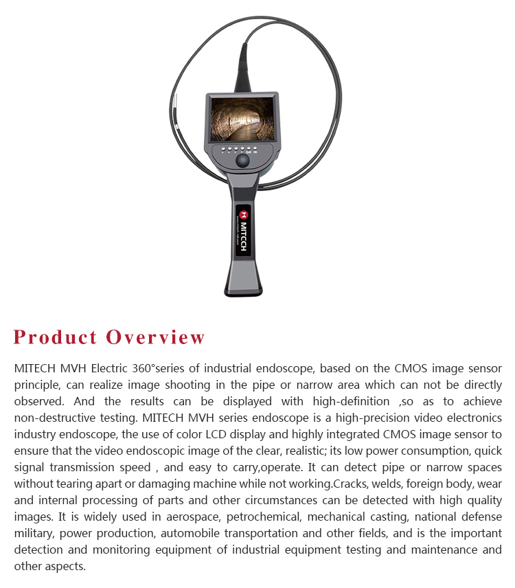 Product OverviewMITECH MVH Electric 360°series of industrial endoscope, based on the CMOS image sensor principle, can realize image shooting in the pipe or narrow area which can not be directly observed. And the results can be displayed with high-definition ,so as to achieve non-destructive testing. MITECH MVH series endoscope is a high-precision video electronics industry endoscope, the use of color LCD display and highly integrated CMOS image sensor to ensure that the video endoscopic image of the clear, realistic; its low power consumption, quick signal transmission speed , and easy to carry,operate. It can detect pipe or narrow spaces without tearing apart or damaging machine while not working.Cracks, welds, foreign body, wear and internal processing of parts and other circumstances can be detected with high quality images. It is widely used in aerospace, petrochemical, mechanical casting, national defense military, power production, automobile transportation and other fields, and is the important detection and monitoring equipment of industrial equipment testing and maintenance and other aspects.