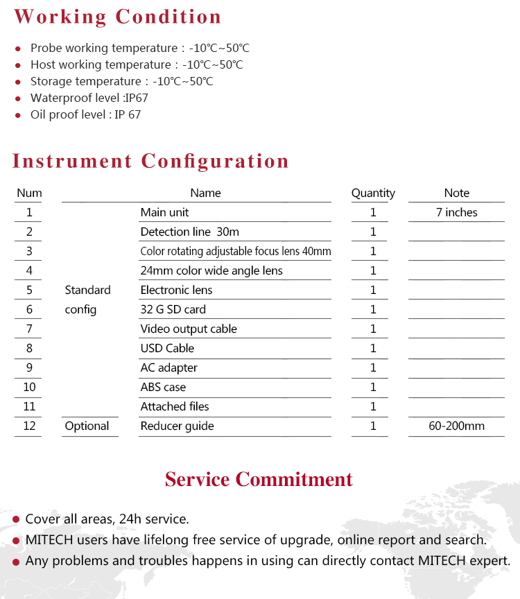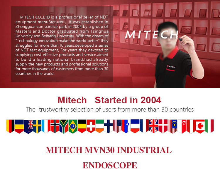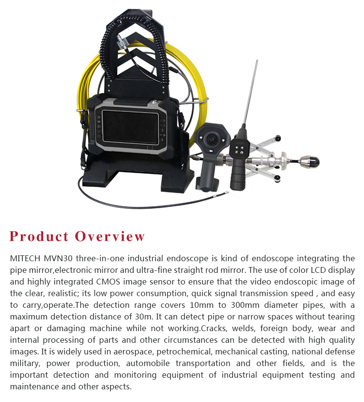 MITECH MVN30 three-in-one industrial endoscope is kind of endoscope integrating the pipe mirror,electronic mirror and ultra-fine straight rod mirror. The use of color LCD display and highly integrated CMOS image sensor to ensure that the video endoscopic image of the clear, realistic; its low power consumption, quick signal transmission speed , and easy to carry,operate.The detection range covers 10,, to 300mm diameter pipes, with a maximum detection distance of 30m. It can detect pipe or narrow spaces without tearing apart or damaging machine while not working.Cracks, welds, foreign body, wear and internal processing of parts and other circumstances can be detected with high quality images. It is widely used in aerospace, petrochemical, mechanical casting, national defense military, power production, automobile transportation and other fields, and is the important detection and monitoring equipment of industrial equipment testing and maintenance and other aspects.