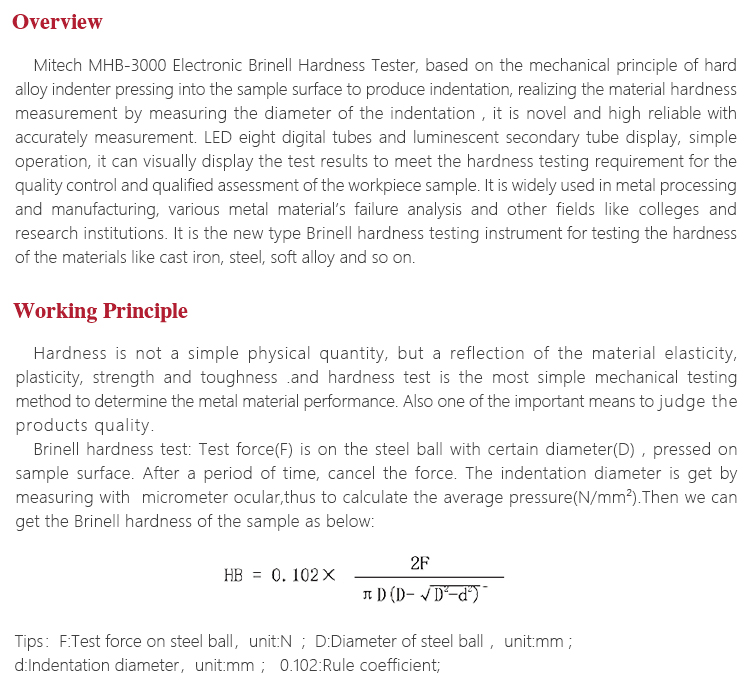Mitech MHB-3000 Electronic Brinell Hardness Tester, based on the mechanical principle of hard alloy indenter pressing into the sample surface to produce indentation, realizing the material hardness measurement by measuring the diameter of the indentation , it is novel and high reliable with accurately measurement. LED eight digital tubes and luminescent secondary tube display, simple operation, it can visually display the test results to meet the hardness testing requirement for the quality control and qualified assessment of the workpiece sample. It is widely used in metal processing and manufacturing, various metal material’s failure analysis and other fields like colleges and research institutions. It is the new type Brinell hardness testing instrument for testing the hardness of the materials like cast iron, steel, soft alloy and so on.