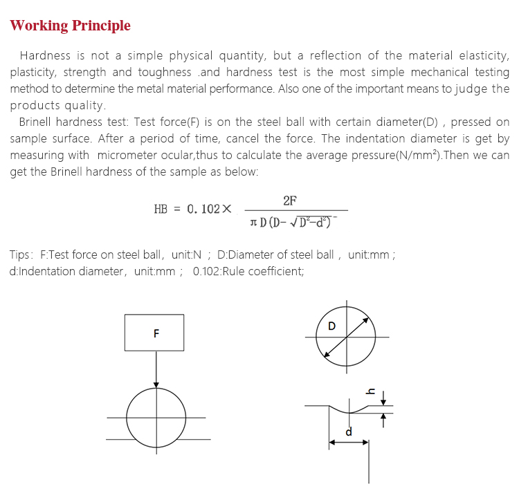 Brinell hardness test: Test force(F) is on the steel ball with certain diameter(D) , pressed on sample surface. After a period of time, cancel the force. The indentation diameter is get by measuring with micrometer ocular,thus to calculate the average pressure(N/mm2).