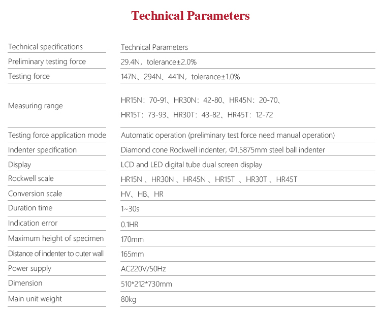 | Indentor specification | Diamond cone Rockwell indenter, Φ1.5875mm steel ball indenter. |