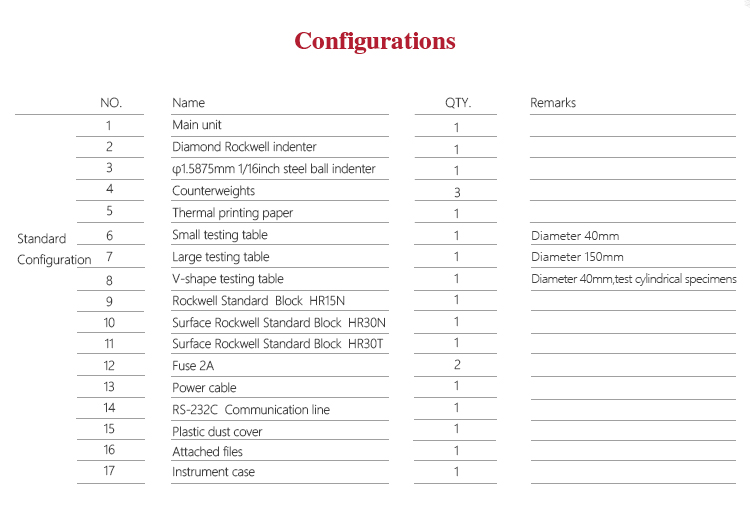 l Option for various specifications of the indenter, support many types of Rockwell hardness scales testing ;