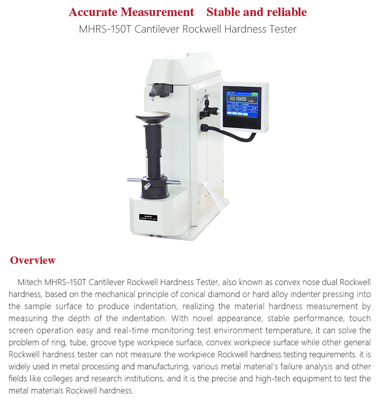 Mitech MHRS-150T Cantilever Rockwell Hardness Tester, also known as convex nose dual Rockwell hardness, based on the mechanical principle of conical diamond or hard alloy indenter pressing into the sample surface to produce indentation, realizing the material hardness measurement by measuring the depth of the indentation. With novel appearance, stable performance, touch screen operation easy and real-time monitoring test environment temperature, it can solve the problem of ring, tube, groove type workpiece surface, convex workpiece surface while other general Rockwell hardness tester can not measure the workpiece Rockwell hardness testing requirements. it is widely used in metal processing and manufacturing, various metal material’s failure analysis and other fields like colleges and research institutions, and it is the precise and high-tech equipment to test the metal materials Rockwell hardness.