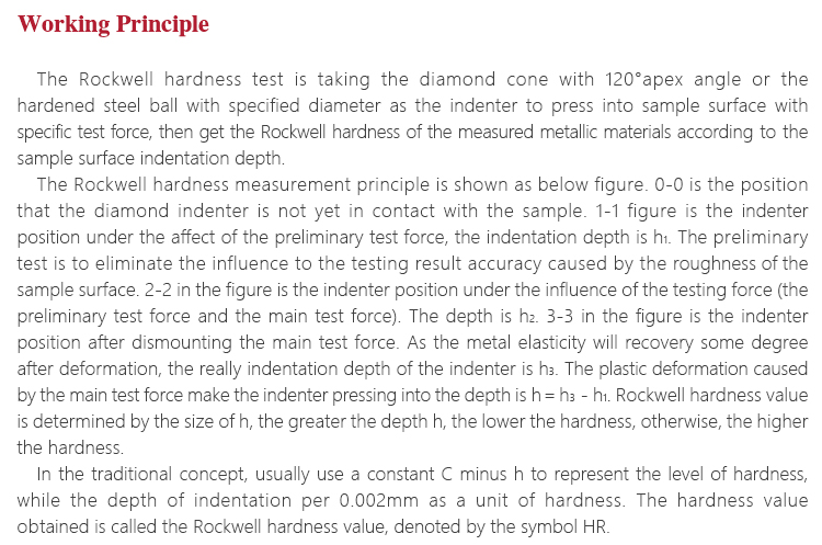The Rockwell hardness measurement principle is shown as below figure. 0-0 is the position that the diamond indenter is not yet in contact with the sample. 1-1 figure is the indenter position under the affect of the preliminary test force, the indentation depth is h1. The preliminary test is to eliminate the influence to the testing result accuracy caused by the roughness of the sample surface. 2-2 in the figure is the indenter position under the influence of the testing force (the preliminary test force and the main test force). The depth is h2. 3-3 in the figure is the indenter position after dismounting the main test force. As the metal elasticity will recovery some degree after deformation, the really indentation depth of the indenter is h3. The plastic deformation caused by the main test force make the indenter pressing into the depth is hh3h1. Rockwell hardness value is determined by the size of h, the greater the depth h, the lower the hardness, otherwise, the higher the hardness.