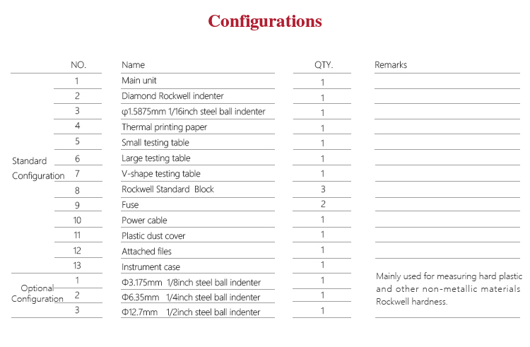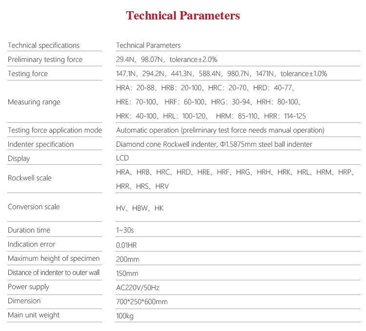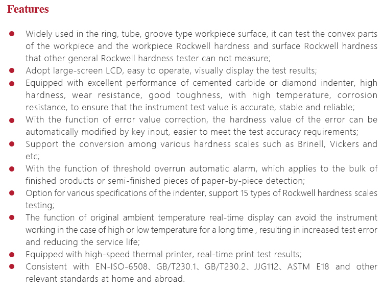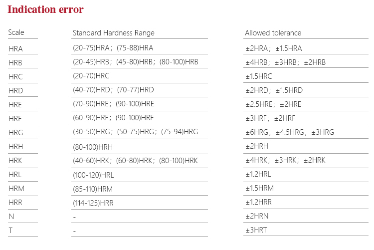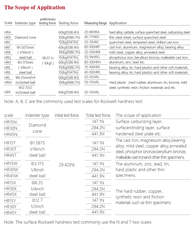 Measuring range HRA:20-88、HRB:20-100、HRC:20-70、HRD:40-77、 HRE:70-100、 HRF:60-100、HRG:30-94、HRH:80-100、HRK:40-100、HRL