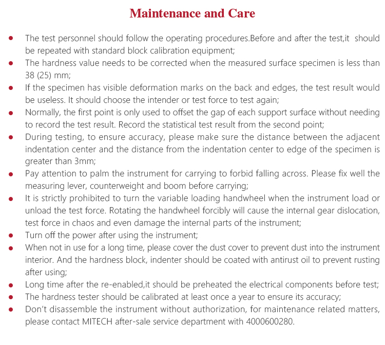 l The hardness tester should be calibrated at least once a year to ensure its accuracy;