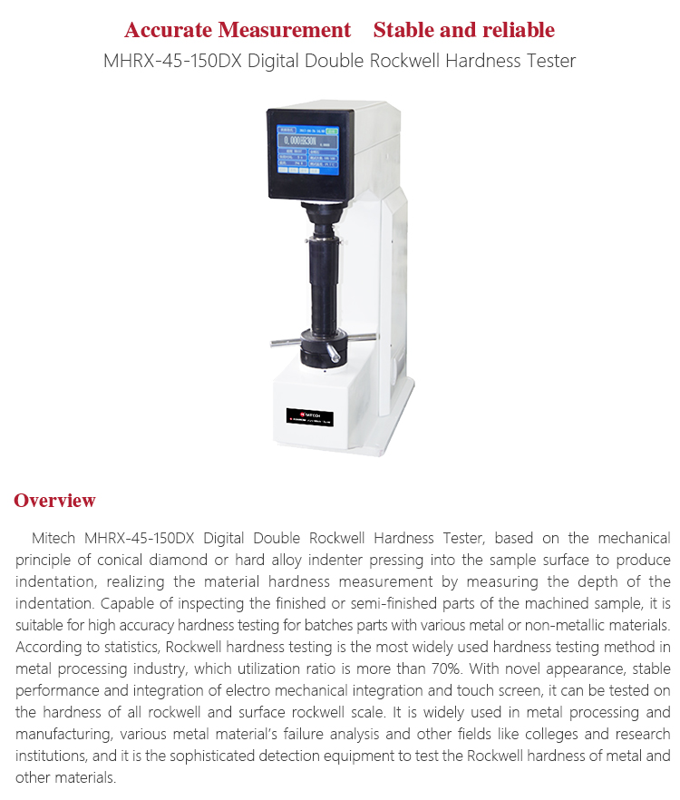 Mitech MHRX-45-150DX Digital Double Rockwell Hardness Tester, based on the mechanical principle of conical diamond or hard alloy indenter pressing into the sample surface to produce indentation, realizing the material hardness measurement by measuring the depth of the indentation. Capable of inspecting the finished or semi-finished parts of the machined sample, it is suitable for high accuracy hardness testing for batches parts with various metal or non-metallic materials. According to statistics, Rockwell hardness testing is the most widely used hardness testing method in metal processing industry, which utilization ratio is more than 70%. With novel appearance, stable performance and integration of electro mechanical integration and touch screen, it can be tested on the hardness of all rockwell and surface rockwell scale. It is widely used in metal processing and manufacturing, various metal material’s failure analysis and other fields like colleges and research institutions, and it is the sophisticated detection equipment to test the Rockwell hardness of metal and other materials.