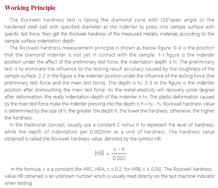The Rockwell hardness measurement principle is shown as below figure. 0-0 is the position that the diamond indenter is not yet in contact with the sample. 1-1 figure is the indenter position under the affect of the preliminary test force, the indentation depth is h1. The preliminary test is to eliminate the influence to the testing result accuracy caused by the roughness of the sample surface. 2-2 in the figure is the indenter position under the influence of the testing force (the preliminary test force and the main test force). The depth is h2. 3-3 in the figure is the indenter position after dismounting the main test force. As the metal elasticity will recovery some degree after deformation, the really indentation depth of the indenter is h3. The plastic deformation caused by the main test force make the indenter pressing into the depth is hh3h1. Rockwell hardness value is determined by the size of h, the greater the depth h, the lower the hardness, otherwise, the higher the hardness.