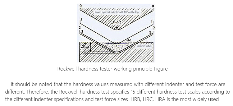It should be noted that the measured hardness values would be different with different indenter and test force. Therefore, the Rockwell hardness testing specifies 15 different hardness test scales according to the different indenter specification and test force sizes. And the HRB, HRC, HRA are the most widely used.
