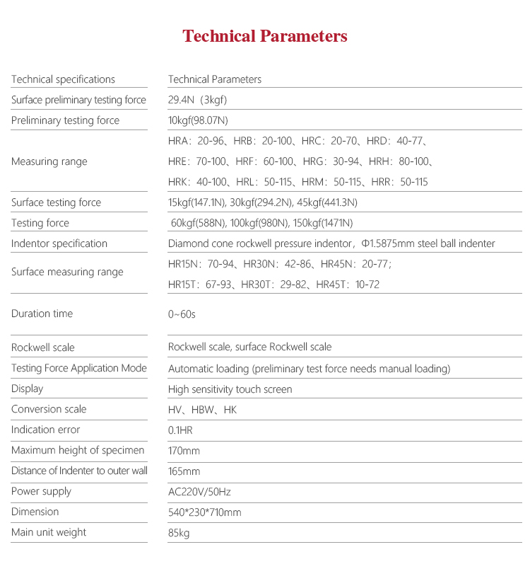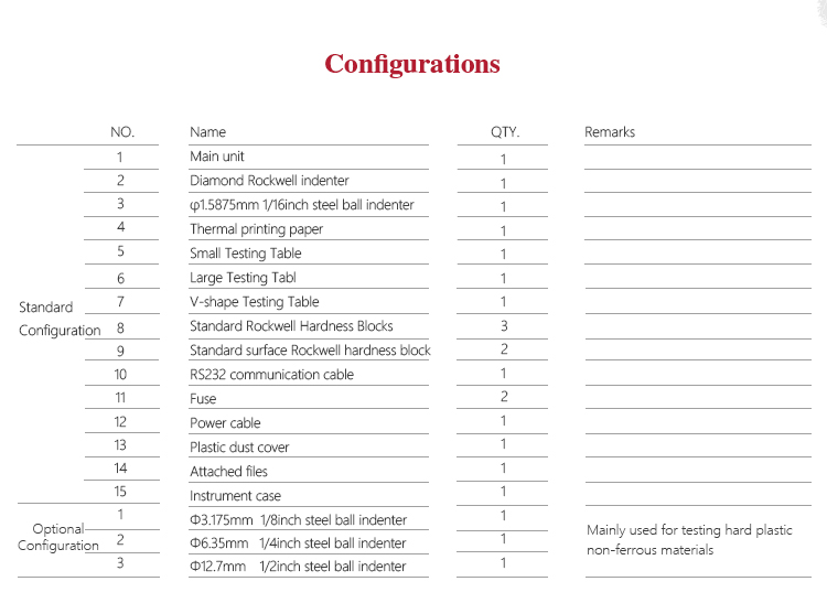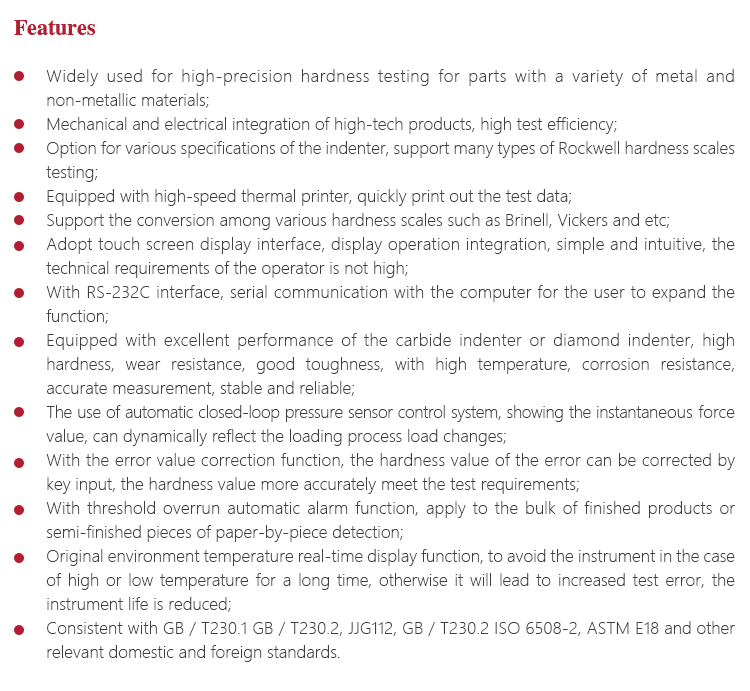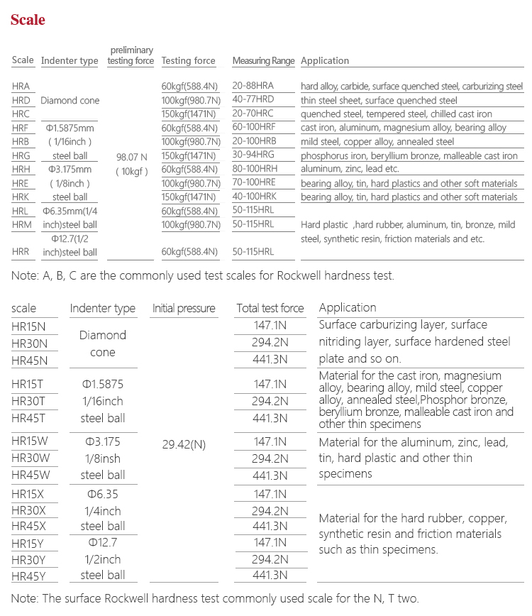 Measuring range HRA:20-96、 HRB:20-100、HRC:20-70、 HRD:40-77、 HRE:70-100、HRF:60-100 HRG:30-94、 HRH:80-100、HRK:40-100、