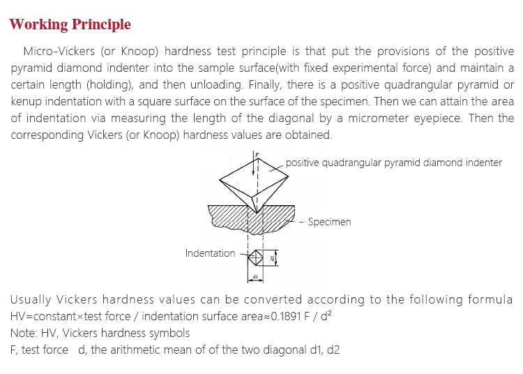 Working PrincipleMicro-Vickers (or Knoop) hardness test principle is that put the provisions of the positive pyramid diamond indenter into the sample surface(with fixed experimental force) and maintain a certain length (holding), and then unloading. Finally, there is a positive quadrangular pyramid or kenup indentation with a square surface on the surface of the specimen. Then we can attain the area of indentation via measuring the length of the diagonal by a micrometer eyepiece. Then the corresponding Vickers (or Knoop) hardness values are obtaine.