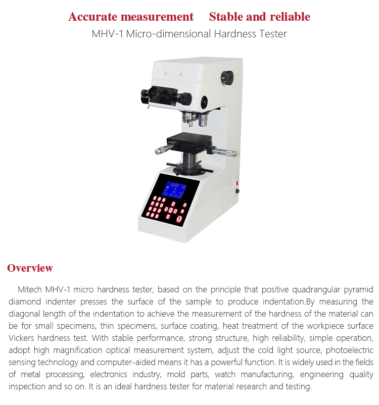 Product OverviewMitech MHV-1 micro hardness tester, based on the principle that positive quadrangular pyramid diamond indenter presses the surface of the sample to produce indentation.By measuring the diagonal length of the indentation to achieve the measurement of the hardness of the material can be for small specimens, thin specimens, surface coating, heat treatment of the workpiece surface Vickers hardness test. With stable performance, strong structure, high reliability, simple operation, adopt high magnification optical measurement system, adjust the cold light source, photoelectric sensing technology and computer-aided means it has a powerful function. It is widely used in the fields of metal processing, electronics industry, mold parts, watch manufacturing, engineering quality inspection and so on. It is an ideal hardness tester for material research and testing.