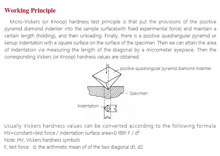 Working PrincipleMicro-Vickers (or Knoop) hardness test principle is that put the provisions of the positive pyramid diamond indenter into the sample surface(with fixed experimental force) and maintain a certain length (holding), and then unloading. Finally, there is a positive quadrangular pyramid or kenup indentation with a square surface on the surface of the specimen. Then we can attain the area of indentation via measuring the length of the diagonal by a micrometer eyepiece. Then the corresponding Vickers (or Knoop) hardness values are obtained.