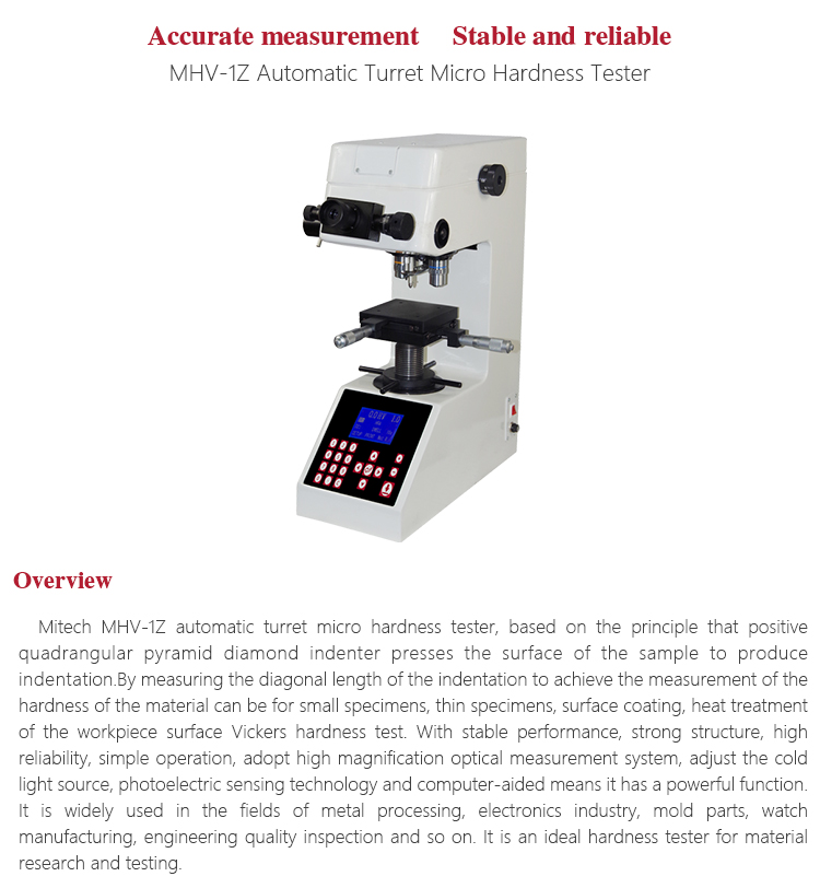 Product OverviewMitech MHV-1Z automatic turret micro hardness tester, based on the principle that positive quadrangular pyramid diamond indenter presses the surface of the sample to produce indentation.By measuring the diagonal length of the indentation to achieve the measurement of the hardness of the material can be for small specimens, thin specimens, surface coating, heat treatment of the workpiece surface Vickers hardness test. With stable performance, strong structure, high reliability, simple operation, adopt high magnification optical measurement system, adjust the cold light source, photoelectric sensing technology and computer-aided means it has a powerful function. It is widely used in the fields of metal processing, electronics industry, mold parts, watch manufacturing, engineering quality inspection and so on. It is an ideal hardness tester for material research and testing.