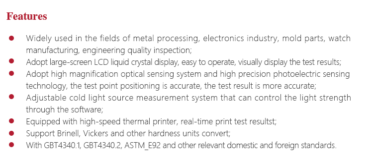 Product OverviewMitech MHVS-1digital micro hardness tester, based on the principle that positive quadrangular pyramid diamond indenter presses the surface of the sample to produce indentation.By measuring the diagonal length of the indentation to achieve the measurement of the hardness of the material can be for small specimens, thin specimens, surface coating, heat treatment of the workpiece surface Vickers hardness test. Adopted computer-aided, high-rate optical measurement system, photoelectric sensor technology, adjustable light, it is the upgrading products of universal type of micro hardness tester and widely used in the fields of metal processing, electronics industry, mold parts, watch manufacturing, engineering quality inspection and so on. It is an ideal hardness tester for material research and testing.