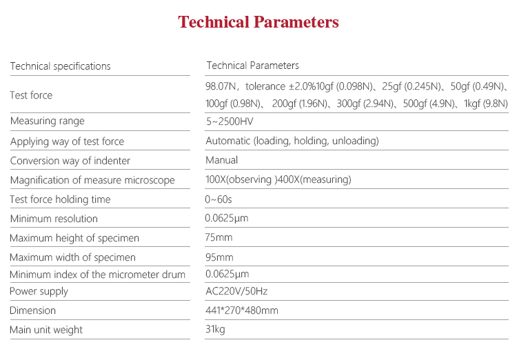| Test force | 98.07N,tolerance ±2.0%10gf (0.098N)、25gf (0.245N)、50gf (0.49N)、100gf (0.98N)、 200gf (1.96N)、300gf ( |