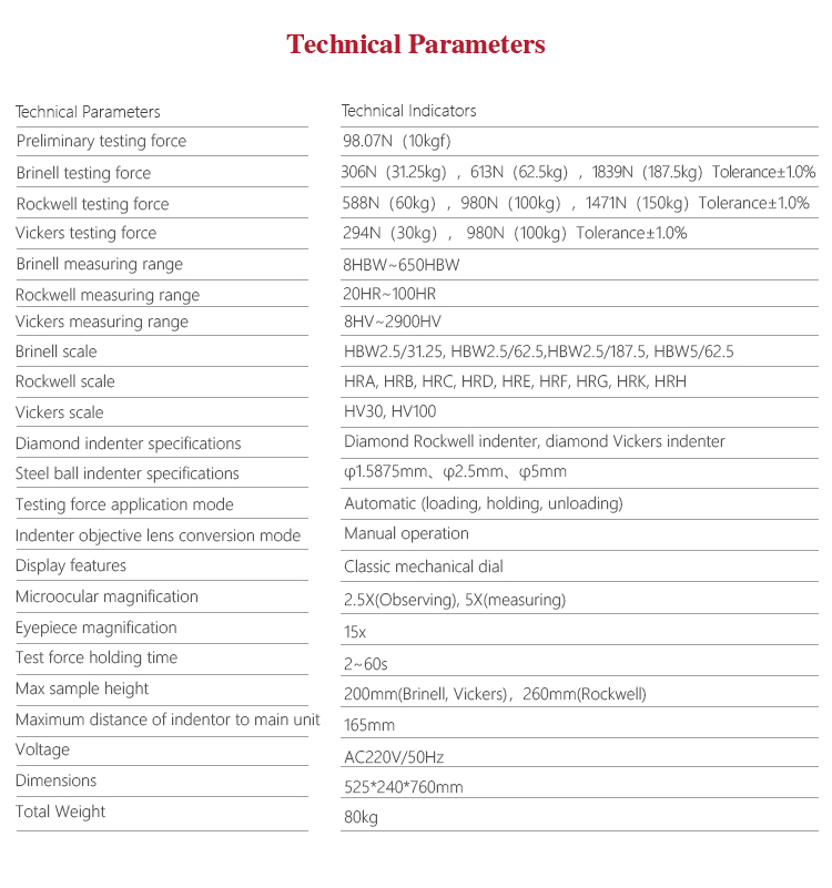 l Equipped with Brinell, Rockwell, Vickers three hardness test indenter, full-featured, widely used that can meet a variety of hardness testing needs of metal and non-metallic materials;