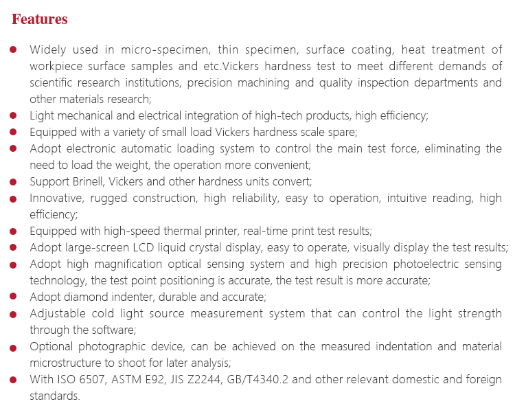 l With ISO 6507, ASTM E92, JIS Z2244, GB/T4340.2 and other relevant domestic and foreign standards.
