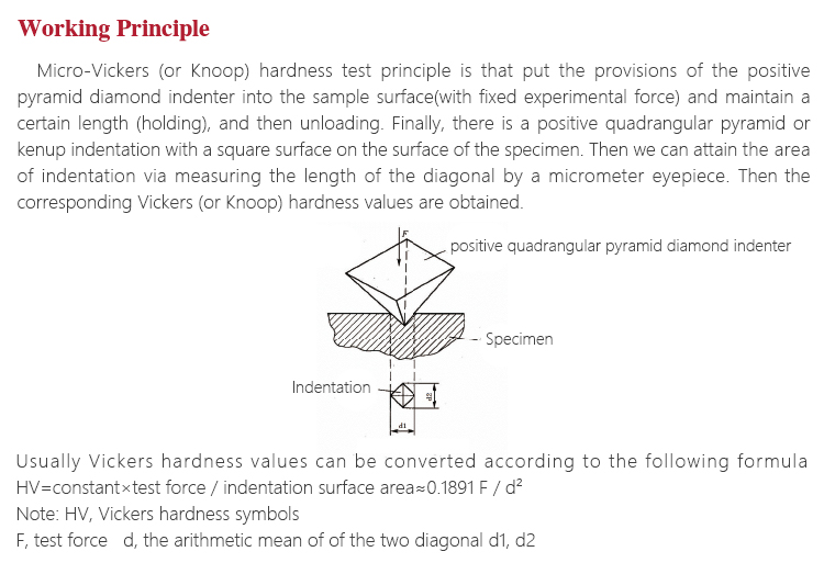 Micro-Vickers (or Knoop) hardness test principle is that put the provisions of the positive pyramid diamond indenter into the sample surface(with fixed experimental force) and maintain a certain length (holding), and then unloading. Finally, there is a positive quadrangular pyramid or kenup indentation with a square surface on the surface of the specimen. Then we can attain the area of indentation via measuring the length of the diagonal by a micrometer eyepiece. Then the corresponding Vickers (or Knoop) hardness values are obtained.