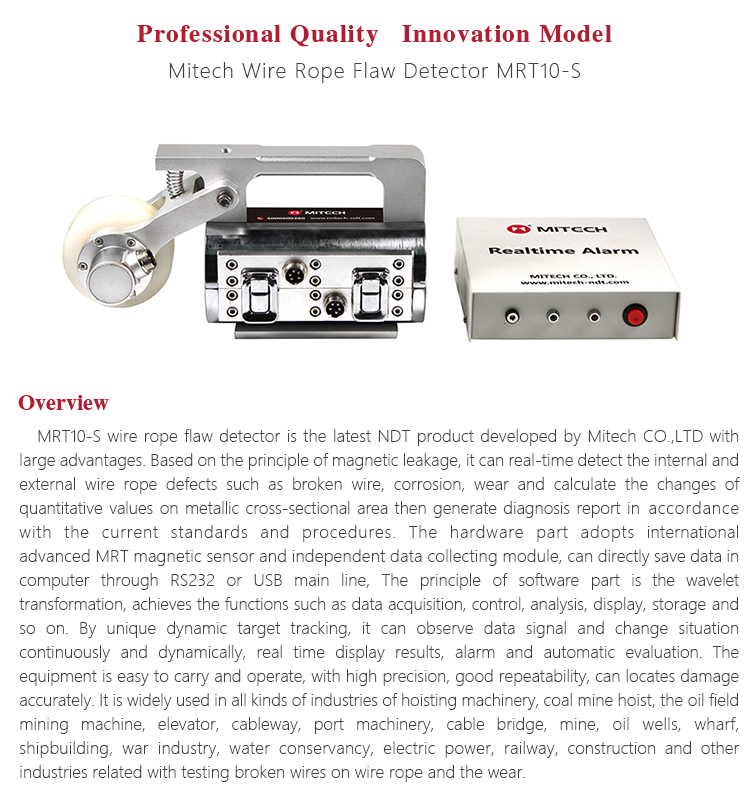 MRT10-S wire rope flaw detector is the latest NDT product developed by Mitech CO.,LTD. Based on the principle of magnetic leakage, it can real-time detect the internal and external wire rope defects such as broken wire, corrosion, wear and calculate the changes of quantitative values on metallic cross-sectional area then generate diagnosis report in accordance with the current standards and procedures. The hardware part adopts international advanced MRT magnetic sensor and independent data collecting module, can directly save data in computer through RS232 or USB main line, The principle of software part is the wavelet transformation, achieves the functions such as data acquisition, control, analysis, display, storage and so on. By unique dynamic target tracking, it can observe data signal and change situation continuously and dynamically, real time display results, alarm and automatic evaluation. The equipment is easy to carry and operate, with high precision, good repeatability, can locate damage accurately. It is widely used in all kinds of industries of hoisting machinery, coal mine hoist, the oil field mining machine, elevator, cableway, port machinery, cable bridge, mine, oil wells, wharf, shipbuilding, war industry, water conservancy, electric power, railway, construction and other industries related with testing broken wires on wire rope and the wear.