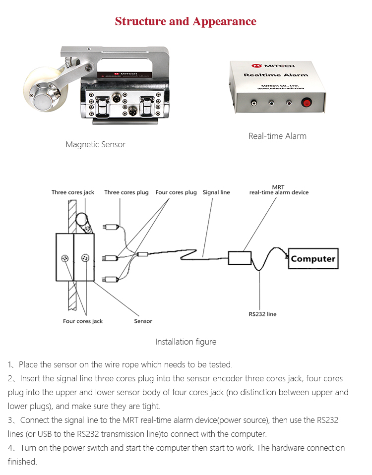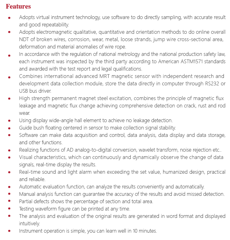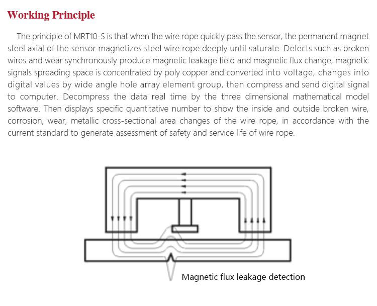 The principle of MRT10-S is that when the wire rope quickly pass the sensor, the permanent magnet steel axial of the sensor magnetizes steel wire rope deeply until saturate. Defects such as broken wires and wear synchronously produce magnetic leakage field and magnetic flux change, magnetic signals spreading space is concentrated by poly copper and converted into voltage, changes into digital values by wide angle hole array element group, then compress and send digital signal to computer. Decompress the data real time by the three dimensional mathematical model software. Then displays specific quantitative number to show the inside and outside broken wire, corrosion, wear, metallic cross-sectional area changes of the wire rope, in accordance with the current standard to generate assessment of safety and service life of wire rope.