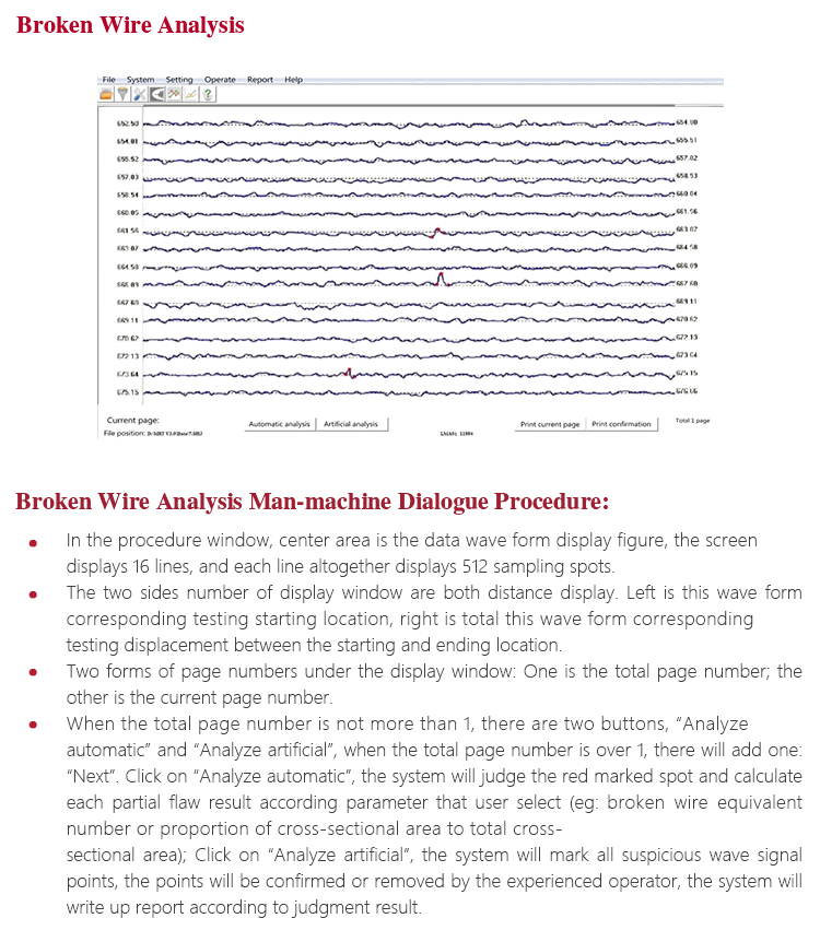 l Adopts electromagnetic qualitative, quantitative and orientation methods to do online overall NDT of broken wires, corrosion, wear, metal, loose strands, jump wire cross-sectional area, deformation and material anomalies of wire rope.