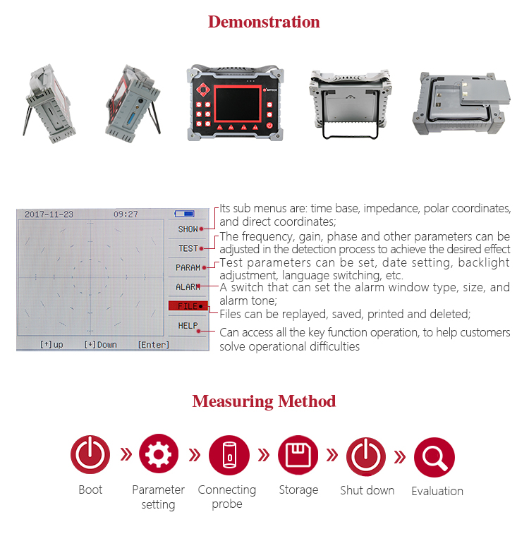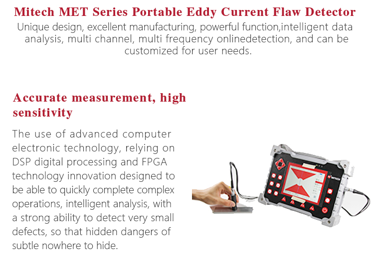 Mitech MET Series Portable Eddy Current Flaw Detector,also known as digital electromagnetic detecor,based on the principle of electromagnetic induction,can detect various metal parts surface or near surface defects with high-speed. It uses advanced DSP digital processing and FPGA technology innovation designed, with 5.7-inch TFT LCD screen, can clearly display the detection data.The product has high sensitivity, stable performance, multi-channel simultaneous detection and intelligent data analysis, can be equipped with intelligent probe, can also be customized probe according to customer needs , with extended magnetic memory, coating thickness, conductivity measurement and other practical Features. It is widely used in all kinds of metal pipe rods, auto parts, bearings, oil casing, oil control rods, ring metal parts in non-destructive testing and scientific research and other areas of higher education research.It is the necessary professional precision testing equipment to improve production efficiency, saving production costs.