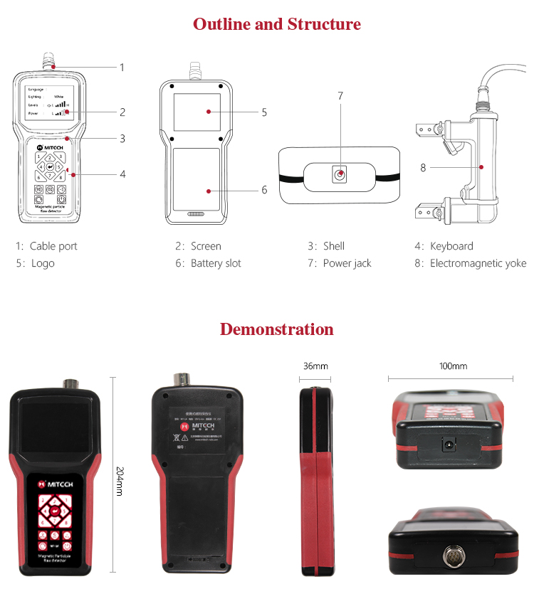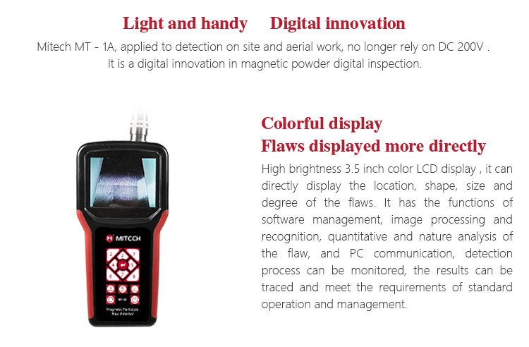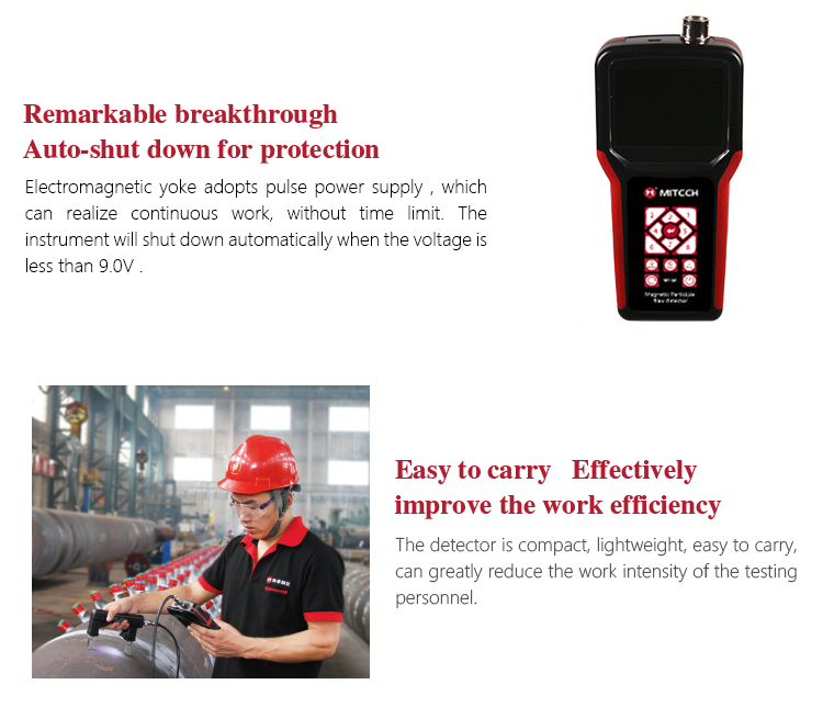 l The brightness, power, lighting form of Mitech portable magnetic flaw detector series are adjustable, to meet the needs of different testing environment.