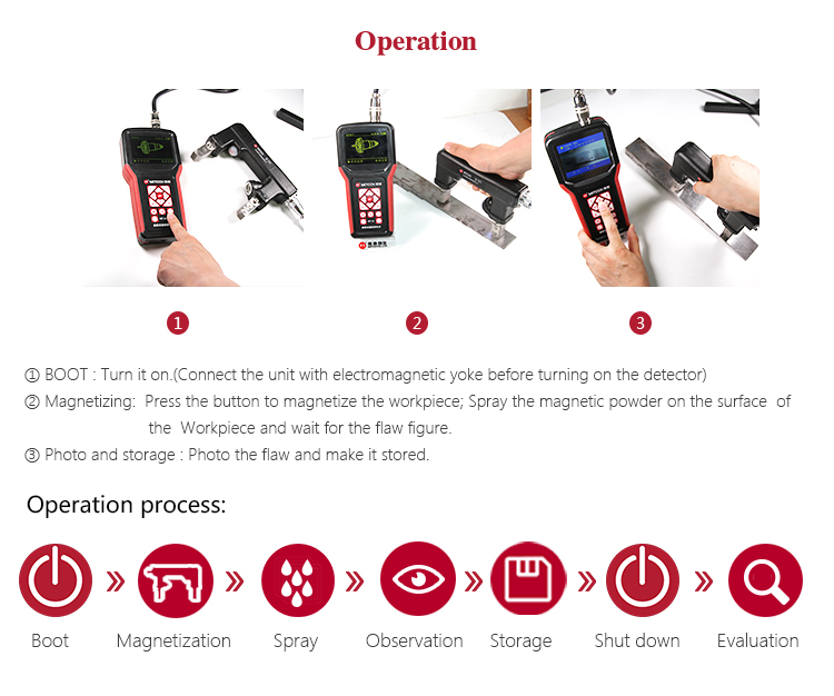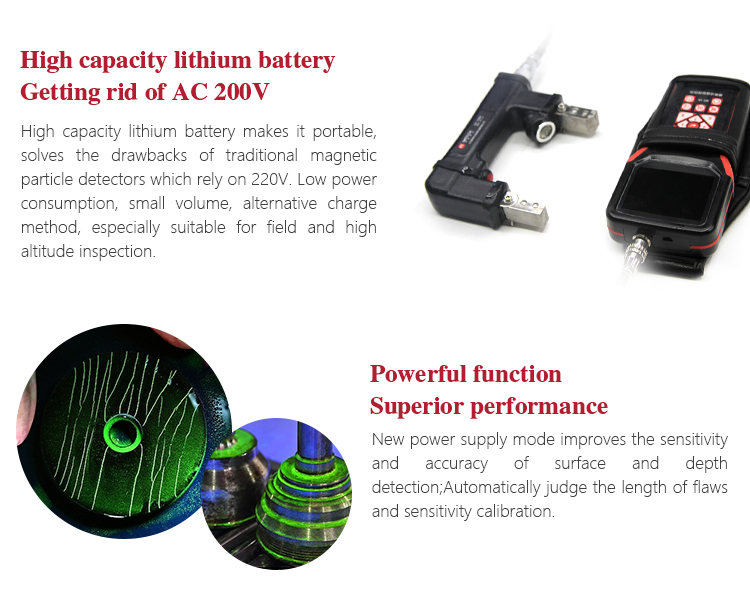 Instrument Featuresl The large capacity lithium battery makes it portable, solves the drawbacks of traditional, magnetic particle detector relying on the 220V power supply, with low power consumption, small size, battery can be charged when the detector is on and off. It is especially suitable for testing in field or high altitude;
