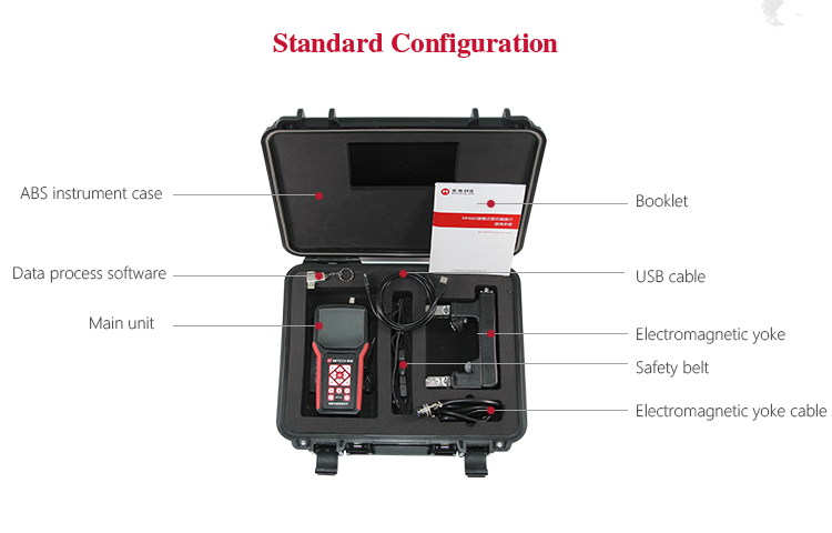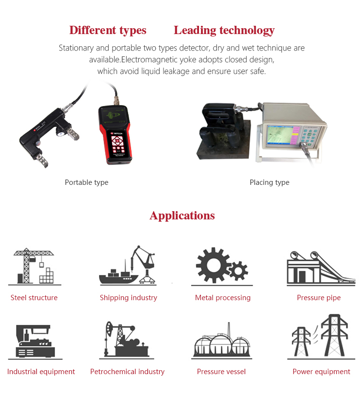 Function & applicationIt is widely used in the industry of aircraft manufacturing, boiler and pressure vessel, electric, oil field, shipbuilding, turbine and combustion engine parts, mine, machinery, standard parts, oil pump, vehicle parts, bridging, chemical, railway, large mechanical components, steel structure equipment etc. It mainly detects the surface detection of forging, quenching, welding, fatigue, for example, irregular workpiece of chain, crankshaft, bearing, high strength bolt, spring, forging, petrochemical pipe, valve, vane, gear, anchor chain, welding seam etc.