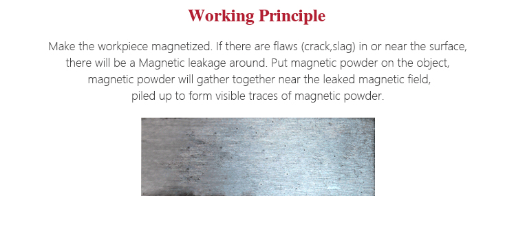 Working PrinciplePut the workpiece into high-intensity magnetic field, connect electric to make it magnetized, if there are flaws (crack,slag) in or near the surface, there will be a leakage around the flaws. Put good quality magnetic powder(usually the magnetic iron oxide powder)on the object, magnetic powder will gather together near the leaked magnetic field, piled up to form visible traces of magnetic powder. In the proper light, we can see the marks and judge the position, size, shape and degree of the flaws.