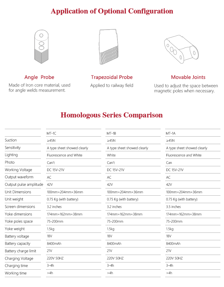 Product OverviewMT-1A digital portable magnetic flaw detector, adopts large capacity lithium battery power supply. DC is exchanged into AC by the inverter and the phase shifted signal processor to provide power for the detector, it solves the shortcomings of traditional magnetic particle detector relying on the 220V power supply. It has low power consumption and can continuous work for more than 4 hours. The battery can be charged while working or off. It can real-time monitoring, process image, save data, print the test report, track inspection results, meet the requirements of standard operation and management. Especially suitable for the field without power supply field testing and high-altitude operations, it realizes the innovation of magnetic powder digital inspection.