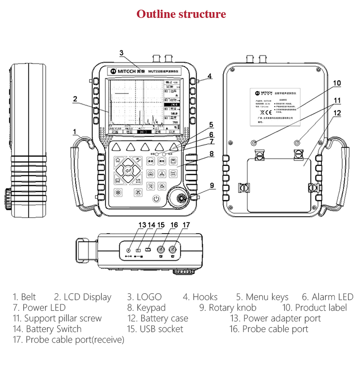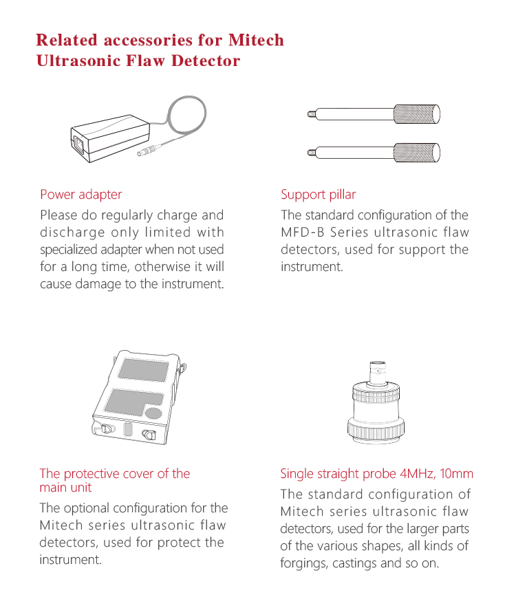 | Mitech B series products of Ultrasonic flaw detector have internal rechargeable Li-ion battery pack rated 7.2V at 8800 mAh,is the standard configuration.When using ,don't disassemble ,and only for supplied charger ,otherwise ,the battery will be damaged .If it’s not used for a long time, be sure to regularly charge and discharge(about once a month), so as to avoid failure. |