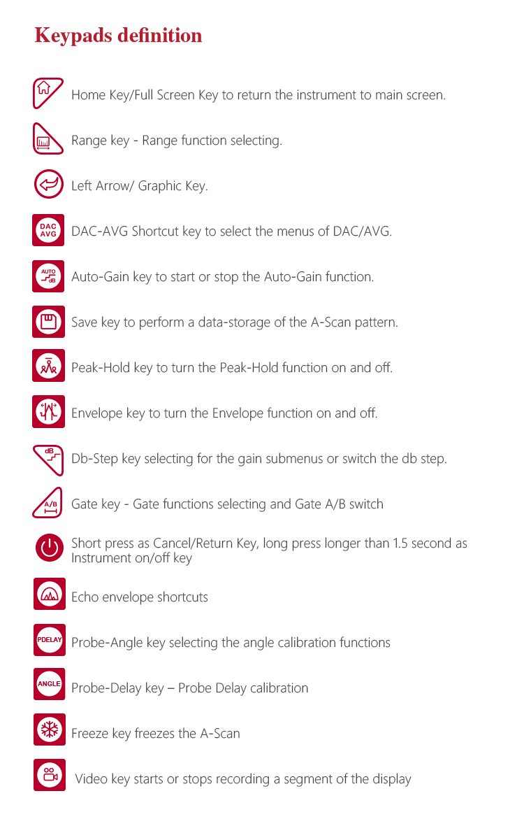 | Memory | be able to store, recall the A-Scan patterns and instrument settings. |